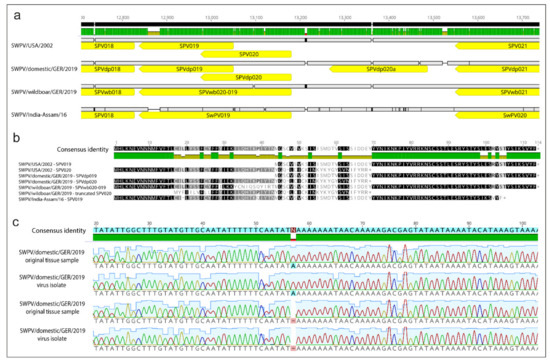 Analysis of SWPV specific genes in domestic pig and wild boar strains. (a) Schematic representation of the SPV019 and SPV020 ORFs present in different SWPV strains. Fusion of these genes via different single nucleotide deletions is apparent in the Indian domestic pig strain (SWPV/India-Assam/16, GenBank accession no. MW036632) and German wild boar SWPV strain (SWPV/wildboar/GER/2019, GenBank accession no. MZ773480). The SPV019 and SPV020 ORFs are present as separate overlapping ORFs in the American domestic pig strain (SWPV/USA/2002, GenBank accession no. NC_003389) and German domestic pig strain (SWPV/domestic/GER/2019, GenBank accession no. MZ773481). (b) Amino acid alignment between the SPV019 and SPV020 ORFs of different SWPV strains. A truncated variant of SPV020 is also present in the German wild boar SWPV genome and a novel ORF (SPVdp020a) exists downstream of SPV020 in the German domestic pig SWPV genome. (c) Analysis of DNA extracted from tissues samples from swinepox cases shows evidence of a single nucleotide deletion at position 13,096 bp in SPV020 ORF in the genome of a German wild boar SWPV strain from 2019 in both the virus isolate and the original tissue sample. This nucleotide deletion is not present in the isolate of the German domestic pig SWPV strain or in the original tissue sample. Alignments and analysis were performed using Geneious Prime (Biomatters, Ltd., Auckland, New Zealand).