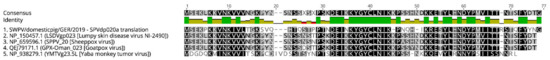 Alignment of the predicted amino acid sequence of a hypothetical protein encoded by the novel SPVdp020a present downstream of SPVdp020 in SWPV/domestic/GER/2019 with predicted proteins encoded by other poxviruses which display the closest predicted homology. The alignment and analysis were performed using Geneious Prime (Biomatters, Ltd.).