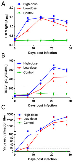 All animals were seronegative for TBEV at the time of inoculation, as demonstrated by both ELISA and VNT. Dogs in both experimental groups (low- and high-dose) developed a robust antibody response, based on ELISA and VNT measurements. The inoculated dogs showed positive results for TBEV IgM as early as day 7 p.i., and they remained positive over the entire experimental period (Figure 2A). Three out of the four inoculated animals showed positive results for TBEV IgG antibodies on day 14 p.i. On day 21 p.i., all four inoculated animals were positive for the presence of TBEV IgG antibodies (Figure 2B). Neutralising titres in three of the four infected dogs reached or exceeded 1:20 as early as day 7 p.i. All four inoculated animals were positive for virus-neutralising antibodies on day 14 p.i. The titres increased with time, reaching or exceeding titres of 1:1280 at the time of experiment termination on day 28 p.i. (Figure 2C). No substantial differences in antibody titres were observed between dogs given a low or high dose of the virus. The control group showed negative results in the ELISA and the VNT throughout the entire experiment.