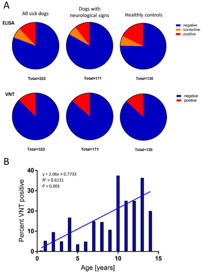 TBEV seroprevalence study in dogs. Serum samples were collected from 453 dogs in the Czech Republic. (A) Pie charts show the results of TBEV tests among healthy dogs (n = 130, right) and dogs investigated for various health problems (all sick dogs, n = 323, left); among the latter, 171 had signs of neurological impairment (dogs with neurological signs, middle). Each pie chart shows the proportion of dogs in each group with TBEV-specific IgG antibodies (ELISA results, upper row) and virus-neutralising antibodies (VNT results, lower row). (B) Correlation analysis shows the relationship between TBEV seropositivity rates and dog age (correlation curve is shown). Age groups comprised at least 10 dogs each.