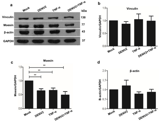 Among the altered proteins from the mass spectrometry analysis, moesin, β-actin, and vinculin were validated to confirm the protein expression levels in the DENV2-infected and/or TNF-α-induced EA.hy926 cells. Western blot analysis and immunofluorescence staining were used.