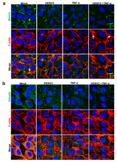 A low expression of moesin, alterations to actin stress fibers, and a dot-like structural formation of vinculin are responsible for the cellular permeability changes of human ECs during dengue virus infection and TNF-α induction.