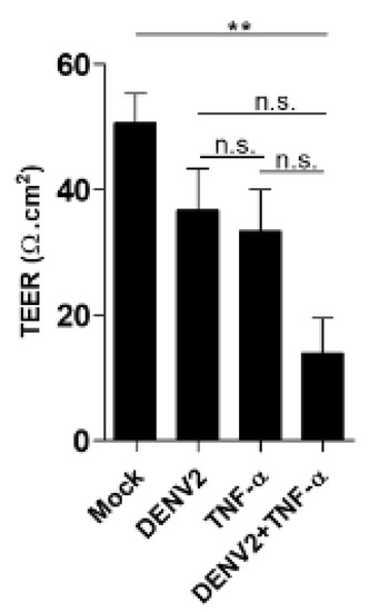 In vitro vascular permeability assay was performed in EA.hy926 cells. The result of 3 TEER experiments in mock, DENV2, TNF-α, and DENV2 plus TNF-α are shown. A p value < 0.05 indicates statistical significance, as follows: ** p < 0.005.