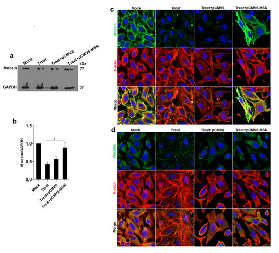 Analysis of moesin overexpression in DENV2 plus TNF-α-treated EA.hy926 cells. A higher moesin level was observed in EA.hy926 cells transfected with recombinant moesin plasmid than in cells transfected with empty plasmid. The intensity of moesin was determined by Western blot (a,b). The localizations of moesin, vinculin, and F-actin are also demonstrated (c,d), * p < 0.05.