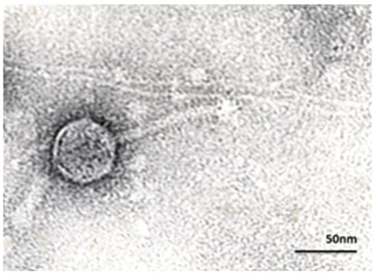 Transmission electron micrograph of B. fragilis-specific phage VA7, exhibiting a siphovirus morphology with an icosahedral head of 60 nm and a tail of 100 nm. Magnification × 250,000.