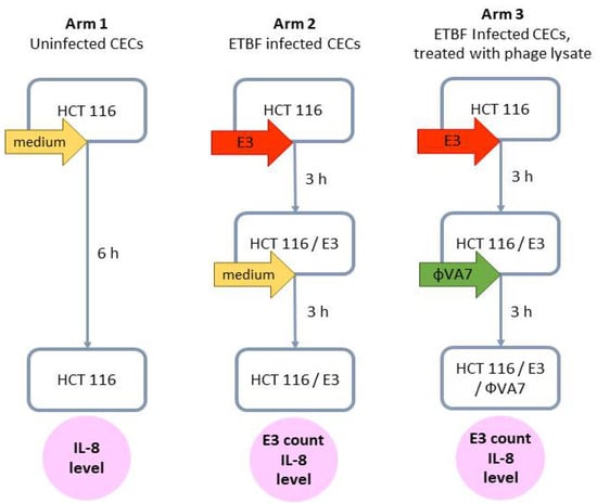 Scheme of the experimental design to evaluate the effect of phage VA7 lysate on enterotoxigenic B. fragilis (ETBF) infection and IL-8 production in colonic epithelial cell (CEC) cultures. For each arm, two distinct experiments (biological replicates) were performed, and for each of these, four samples (technical replicates) were analyzed. In other words, each data point was the result of eight analyses.
