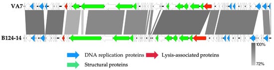 Phage VA7 DNA was extracted from a high-titer phage stock, as described previously [25]. Subsequently, its genome was sequenced using an Illumina MiSeq device (Illumina, San Diego, CA, USA) at the VIB Nucleomics Core (Leuven, Belgium). After sequencing, the raw reads were trimmed (Trimmomatic) and assembled (SPAdes) in one contig [26,27]. Using MEGA X [28], the assembled phage genome was aligned to the closest characterized phage as identified by BLASTn [29] and a ViPTree [30] analysis (Bacteroides phage B124-14; NC_016770). The phage’s taxonomy was further delineated using VIRIDIC [31], which calculates the virus intergenomic distance. Next, the VA7 genome was annotated using RASTtk [32] and manually curated by BLASTp. tRNAs were identified with tRNAscan-SE v2.0. [33,34]. Finally, the phage genome was visualized using EasyFig [34].