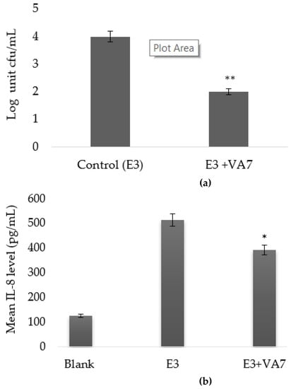 Bactericidal effect (a) and IL-8 modulating effect (b) of VA7 lysate on HCT116 colonic epithelial cell (CEC) cultures infected with enterotoxigenic B. fragilis (ETBF) strain E3. Bacterial counts and IL-8 levels are presented as mean values with error bars representing the 95% confidence intervals (CIs) of the means. A base-10 logarithmic scale is used for the Y-axis of graph a. A statistically significant difference is indicated as * p < 0.05 and ** p < 0.01.