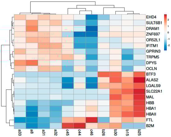 The heatmap of the most significantly deregulated genes between the uninfected goats and goats with high (HPL) and low (LPL) proviral loads. Animals with high (HPL) proviral load: b15, b25, b26 and b30; animals with low (LPL) proviral load: a8, a31, a32, and a33; Uninfected animals: c44, c45, and c46.