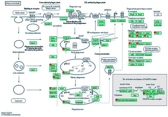 DEGs for which expression has been modified through SRLV infection involved in phagosome pathways (KEGG chx04145). The genes identified as differentially expressed (adjusted p-value < 0.05) between uninfected and infected goats were highlighted red.