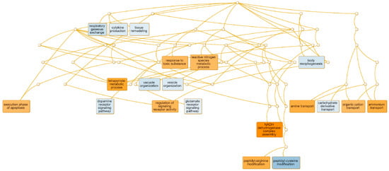Tree graph represented the top 20 (10 up and 10 down) most regulated GO terms. Orange and blue color represented down and upregulated GO term, respectively. (WebGestalt, WEB-based GEne SeT AnaLysis Toolkit).