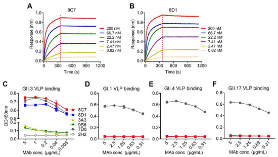 We performed biolayer interferometry (BLI) assays to determine the binding affinity of the mAbs to the GII.3 VLP. The results showed that 8C7 and 8D1 possessed high affinity to the GII.3 VLP with KD values of <0.001 nM, whereas 3A3 and 9B8 had a much lower affinity with KD values being 31 and 0.161 nM, respectively (Table 2). Representative BLI graphs for 8C7 and 8D1 mAbs are shown in Figure 1A,B.