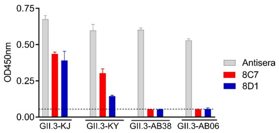 Cross-reactivity of the 8C7 and 8D1 mAbs was tested by ELISA with various wild-type GII.3 VLPs. Rabbit anti-GII.3 VLP antiserum was used as a positive control. Dashed line indicates the value from the blank well (containing no antigen). Data are mean ± SD of triplicate wells.