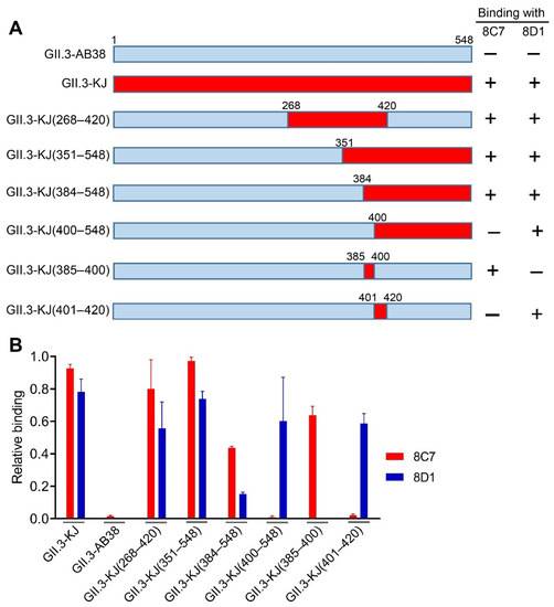 We then substituted residues 385–400 or residues 401–420 in the VP1 protein of GII.3-AB38 with the counterparts from GII.3-KJ, resulting in two additional chimeric VLPs termed GII.3-KJ(385–400) and GII.3-KJ(401–420), respectively (Figure 4A). ELISA analysis showed that 8C7 but not 8D1 could react with GII.3-KJ(385–400) (Figure 4B). Inversely, 8D1 but not 8C7 could bind GII.3-KJ(401–420) (Figure 4B). These data confirmed that 8C7 and 8D1 indeed recognize two distinct epitopes located within the residues 385–400 and 401–420 of the GII.3-KJ VP1 protein, respectively.