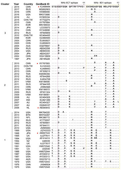 Alignment of the corresponding 8C7 and 8D1 epitope sequences from representative strains of different GII.3 clusters. Information for each strain, including isolation date (year), isolation location (country), and GenBank ID, were shown. The 8C7 and 8D1 epitope regions were boxed with dash lines. Dots represent residues identical to those of the GII.3-KJ strain. Red circle indicates the strains used in this study.