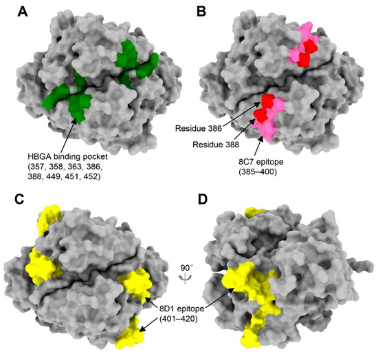 The 8C7 and 8D1 epitopes were mapped onto the surface of the GII.3 P domain dimer (strain TV-24; PDB: 6IR5). (A) Model of GII.3 P domain showing the HBGA binding site (green). (B) Location of 8C7 epitope (hot pink) on GII.3 P domain surface. Residues 386 and 388 are shown in red. (C,D) Location of 8D1 epitope (yellow) on GII.3 P domain surface. Panel (A–C), top view; panel (D), side view. The corresponding residues in the HBGA binding site or the mAb epitopes are included in the parentheses.