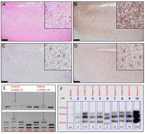 - Areskeviciute, A.; Hogh, P.; Bartoletti-Stella, A.; Melchior, L.C.; Nielsen, P.R.; Parchi, P.; Capellari, S.; Broholm, H.; Scheie, D.; Lund, E.L. A Novel Eight Octapeptide Repeat Insertion in PRNP Causing Prion Disease in a Danish Family. J. Neuropathol. Exp. Neurol. 2019. [Google Scholar] [CrossRef] [PubMed]