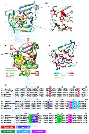 Structural features of HuNoV protease provide important information for the design and optimization of a compound with the goal of developing a drug for clinical use. The atomic structures of proteases from several HuNoVs belonging to different genogroups and genotypes have been determined [62,63,64,65,66,67]. A HuNoV protease, typically around 181 amino acids in length, consists of an N-terminal domain I and a C-terminal domain II connected via a large loop (Figure 1A). HuNoV protease is classified as viral chymotrypsin-like cysteine protease, as it contains a reactive cysteine residue in its active site, which is located at the cleft between the two domains (Figure 1B). Domain I is formed from a two-turn α-helix followed by five β-strands (aI, bI, cI, dI, eI). The five β-strands are connected via loops to form a twisted antiparallel β-sheet. Domain II consists of six β-strands (aII, bII, cII, dII, eII, fII) joined by intervening loops that form an antiparallel β-barrel [64]. Structural alignment of all the six published HuNoV protease structures suggests an overall conserved three-dimensional structure conformation. Five regions, (1) the flexible surface loop from aa 33 to 36, (2) the hairpin loop from aa 107 to 113, (3) the short loop from aa 147 to 150, (4) the β-hairpin loop from aa 162 to 164, and (5) the loop from aa 122 to 134 (Figure 1C), however, do exhibit noticeable conformation variations and the conformational flexibility could be due to the exposure to the solvent. A ConSurf analysis of HuNoV protease showed that these regions are less conserved compared to the active site (Figure 1D). One structural feature of note is that the integrity of the active site is maintained by several hydrogen bonds. The hydrogen bonds formed between the sidechain nitrogen of Lys88 and the backbone carbonyl oxygen of Val9 and between the sidechain nitrogen of Arg8 and the backbone carbonyl oxygen of Thr69 are vital for protease activity [65]. These residues are highly conserved across HuNoV proteases and mutation of these residues abolishes the protease activity [68]. The overall conserved structural features, including the active site, the substrate-binding pockets, and the oxyanion hole, are the target regions for inhibitor design (Figure 1E).