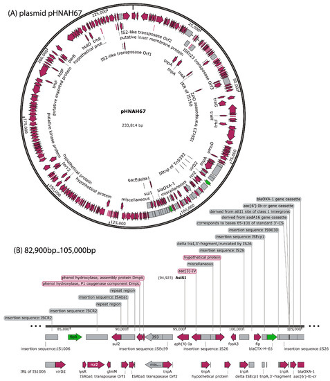 Gene map of lncHI2 plasmid pHNAH67. (A) Full annotated plasmid map. (B) Partial map bp 82,900 to 105,000 indicating the positions of ARG subtypes floR, sul2, aph(4)-Ia, acc(3)-IV, fosA3, blaCTX-M-65, aac(6′)-lb-cr, blaOXA-1, catB3, arr3, and sul1.