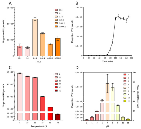 We tested the MOI ranging from 10 to 0.0001 to determine the optimal values for producing maximal phage titers. When the ratio of the phage AH67C600_Q9 and host AH67C600 was 0.1, the titer was maximal at 4.63 × 108 PFU per mL and this optimal MOI was used to guide follow-up experiments (Figure 3A).