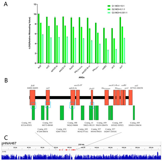 (A) Relative misloading value of 11 ARGs in “misloaded phage”. Results for qPCR assays indicated differences for ARG transmission through generalized transduction in three groups. It is worth noting that the y-axis represented the negative logarithm of relative misloading value. (B) Matching positions of ARGs between contigs and plasmid pHNAH67. The blue dotted frames indicate the alignment of four contigs and ARG sequences. (C) Plasmid pHNAH67 genome coverage pattern associated with generalized transducing by phage AH67C600_Q9. Whole genome sequencing reads were mapped to plasmid in blue. The red regions on the sequence are the 11 ARGs.