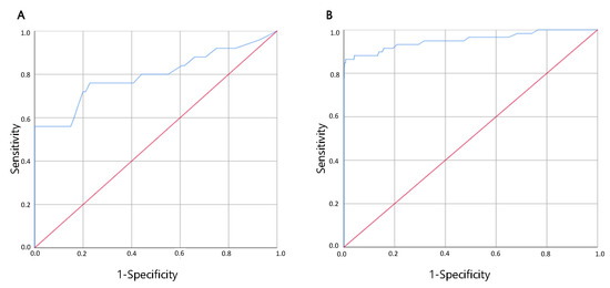 On the left (A), ROC curve for COVID-19 Ag FIA Ag-RDT, compared to real time RT-PCR on the right (B), ROC curve for AFIAS COVID-19 Ag compared to real time RT-PCR. On the x axis, 1-specificity; on y axis, sensitivity.