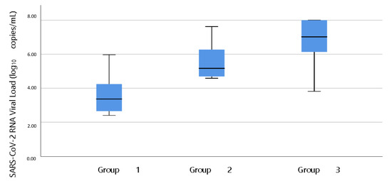 BOX Plot comparing cut-off index (COI) groups with viral loads. Horizontal lines represent mean, blue squares account for the interquartile range and vertical bars represent the lower and upper limits of values (range). Group 1, COI < 1; Group 2, 1 ≤ COI < 12 and Group 3, COI ≥ 12.