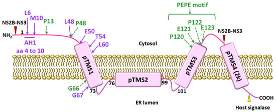 A conserved Pro–Glu–Pro–Glu (PEPE) motif in the hydrophobic C-terminus of WNV NS4A has been shown to be essential for VRC formation (Figure 1, Table 1). Mutations in the PEPE motif impaired VRC formation which in turn abolished viral RNA replication and virion production. The PEPE motif was also found to contribute to proteolytic cleavage to remove the 2k fragment from WNV NS4A, as shown by the fact that the mutations in the PEPE motif perturbed proteolytic processing at the NS2B-NS3 cleavage site upstream of the 2k region, specifically at the first proline and downstream glutamic acid residues []. The authors of that study were inclined to believe that as the PEPE motif was in close proximity to NS2B-NS3 cleavage site, the mutations were preventing NS2B-NS3 protease accessibility and thus activity, resulting in incorrect processing of NS4A which impeded VRC formation [].