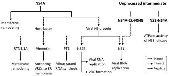 Roles of NS4As in flavivirus replication. NS4As induce membrane remodeling similar to that induced by flavivirus infection. NS4A and the unprocessed intermediates containing NS4A are essential components of viral replication complexes (VRCs), that interacts with host factors or other flavivirus NS proteins to promote efficient viral replication.