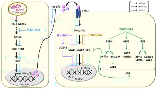 JEV NS4A has been demonstrated to have an antagonistic effect on the IFN-I signaling by reducing the phosphorylation levels of STAT1 and STAT2, thus blocking the downstream activation of the JAK-STAT signaling pathway. JEV NS4A was shown to specifically interact with ATP-dependent RNA helicase DDX42. The DDX42 helicase is a member of the DExD/H-box family of RNA helicases, like RIG-I and MDA5. Overexpression of DDX42 RNA helicase increased the activation of IFN-I signaling induced by exogenously added IFN-β. These data suggest that DDX42 helicase acts as a dsRNA sensor that activates the IFN-I response upon flavivirus infection, and the binding of JEV NS4A to the DDX42 helicase could block IFN-I response [] (Figure 3).