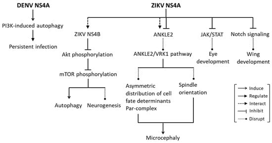 NS4As modulate developmental processes. NS4As modulate autophagy to facilitate persistent infection and manipulate a number of signaling pathways, i.e., Akt-mTOR, ANKLE2/VRK1, JAK/STAT and Notch signaling resulting in developmental defects.