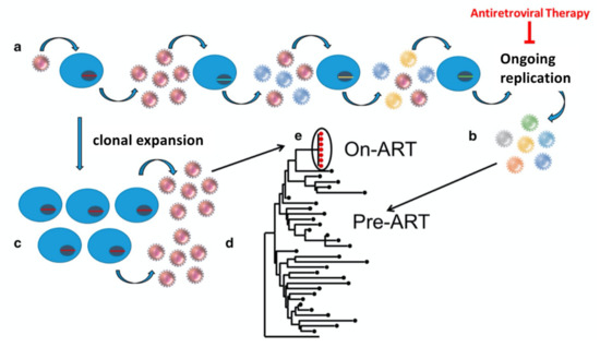 Ongoing HIV replication and clonal expansion. (a) In most individuals, HIV infection starts with a single virion (brown) and, during successive cycles of replication, shown left to right, the viruses in the population accumulate mutations, indicated in (b) by the multicolored virions, and, as shown in (e), a diverse phylogenetic structure. As indicated in (c), ART initiation halts ongoing viral replication, leaving a small fraction of infected cells, which, as shown in (d), grow into clones, a few of which can release virus with identical genome sequences into the blood. Reprinted from [10].