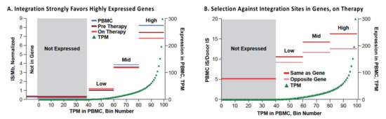 Finally, if a provirus is integrated in highly repeated DNA, the currently available methods using short-read technology cannot readily distinguish among the different copies of the highly repeated DNA. This limitation restricts many of the conclusions that can be reached to proviruses integrated in or very near single-copy regions of the human genome. Fortunately, as will be discussed in the next section, HIV preferentially integrates in the bodies of highly expressed genes, most of which are single-copy. Determining whether proviruses integrated in a particular gene or region of the human genome are selected for or against requires a careful comparison of the numbers/density of the proviruses found in that gene or region immediately after the initial infection, and after a long enough time on ART so that any selection against cells with expressed proviruses would have changed the initial distribution. For this reason, accurate quantitation and precise localization of proviruses integrated in centromeres [49], LINE elements, and other highly repeated sequences will have to wait for a better way to enumerate the proviruses integrated into repeated regions of the human genome.