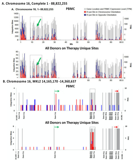 Integration site distribution in vivo and in vitro. Chromosome 16 was divided into 250 bins and the level of RNA, as measured by RNA-seq analysis of PHA-activated PBMCs, in each bin (gray bars) and the integration site distribution (red—the provirus is in the same orientation as the numbering of the chromosome; blue—opposite orientation, relative to the numbering of the chromosome) are shown for each bin. In both panels (A,B), the diagram at the top shows data obtained from PBMCs infected in vitro; the diagram at the bottom shows unique sites from pooled in vivo data. (A) Complete chromosome 16. The long green arrows indicate the location of the MKL2 gene. (B) MKL2 gene. Black arrows indicate exons; short green and red arrows, translation start and stop sites, respectively. Reprinted from [37].