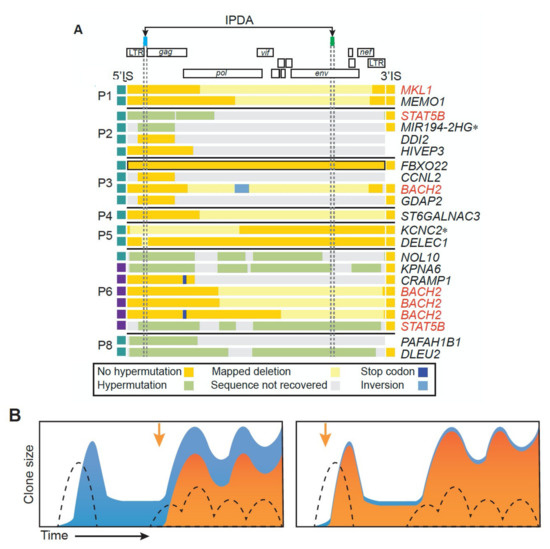 Antigen-driven clonal expansion. (A) Structures of proviruses reported by Simonetti et al. [60] in clonally expanded cells obtained from the on-ART donors indicated on the left are shown schematically, along with the gene in which the provirus was integrated. Genes shown in red are ones in which proviruses can confer a selective advantage (Table 1). The 2 regions marked “IPDA” have been found to be commonly deleted or hypermutated in defective proviruses and are the basis for the selective Intact Provirus Detection Assay [61]. CD4+ T cell clones containing the proviruses shown were reactive to one of two common antigens associated with HIV infection, as shown in the boxes to the left of the provirus: CMV (teal), or HIV Gag (purple). (B) Schematic showing the importance of the relative timing of antigen stimulation and integration on the frequency of cells in a specific HIV-infected T-cell clone. The dotted lines show the relative concentration of stimulating antigen (CMV or HIV, in this case). Solid blue indicates the total size of the specific antigen-reactive CD4+ T cell clone, and the solid orange indicates the proportion of cells in that clone that carry a provirus descended from a cell infected at the time shown by the orange arrow. Note that the time of infection relative to the origin of the CD4+ T cell clone is reflected by the fraction of the cells with a specific rearranged T cell receptor that contain a provirus at a specific integration site. Copyright 2021 American Society for Clinical Investigation (ASCI).