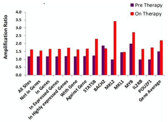 The most striking difference in the distribution of integration sites in vivo and ex vivo is presence, in samples taken from those on long-term ART, of clusters of proviruses in a few specific introns in a handful of oncogenes (Figure 5) [38,56]. We recently identified seven such genes in which a provirus can cause positive selection for the growth and/or survival of the host cell (Table 1) [37]. While it is possible that a much deeper analysis might reveal a few more such clusters, the number of genes in which a provirus can provide positive selection for the host cell will remain very small. Although the regions defined by these clusters have sometimes been referred to as “hot spots” for proviral integration, with the exception of the first intron of STAT5B, they are not particularly good targets for integration. In addition, despite the fact that there is no evidence for integration of proviruses in a specific orientation in any gene, either in vivo or in vitro, the selected proviruses are always found in the same transcriptional orientation as the host gene. These observations strongly support the conclusion that the clustering is the consequence of post-integration selection acting on cells that happened to have acquired a provirus in the right place and orientation.