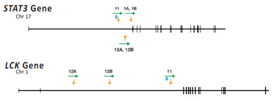 Locations of proviruses in T cell lymphomas. The orange arrows show the location of HIV proviruses in tumors from 3 different individuals (numbers 1, 11, and 12), with tumors obtained from different sites denoted as A and B [59]. The green arrows indicate the orientation of the integrated provirus. The transcribed portion of each gene is shown by the horizontal line, with short vertical lines denoting exons. The light blue arrow indicates the translational start site. Note that, in the case of lymphoma 12, both tumors had a provirus at exactly the same site in STAT3, but, although both tumors had a provirus in in LCK, the proviruses were in different sites. This pattern indicates that STAT3 integration was followed by growth and spread of the tumor, which must have occurred before the two independent integrations into LCK. From [59].