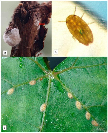 The cottony grape scale Pulvinaria vitis (L), family Coccidae, is a polyphagous species, which feeds on various woody plants (García Morales et al., 2016). It is usually scarce and dispersed in vineyards, but can sometimes proliferate and cause damage, weakening the vine by feeding on phloem sap and excreting honeydew on which sooty mould develops. Population outbreaks in vineyards have been reported in several countries [1,2,3,4]. P. vitis has also been reported as a pest on peach in Canada [5]. It is widely distributed in the Palearctic zone from western Europe to China, and southwards to the Mediterranean area as far as Iran [6]. It was introduced in North [1] and South America [7,8,9], and in New-Zealand [10,11]. P. vitis can reproduce sexually or parthenogenetically and develops one annual generation. Adult insects mate from September to October [3]. Adult females are 5–7 mm long, dark brown and convex, whereas adult males are winged and pinkish, only 1.5 mm long [6]. While males die after mating in the fall, females overwinter and then produce white waxy egg masses from the end of April to early June [3] (Figure 1a). As adults, females become sessile and each of them lays an average of 3500, though sometimes up to 5000, eggs [3], embedded within a cotton-like structure, called the ovisac, which grows beyond the shield and lifts it progressively. The eggs are orange to wine-red in colour and hatch from late May to June. The first instar nymphs (L1 or ‘crawlers’) are only 0.5 mm long, elongated oval in shape, with colour ranging from dark yellow to reddish-brown. The crawlers are very mobile prior to settling along leaf veins to pursue their development. P. vitis is dispersed by wind at any stage when it is active, but especially at the early crawler stage [5]. There are three nymphal stages, the first moult occurs in July and the second in August [3].