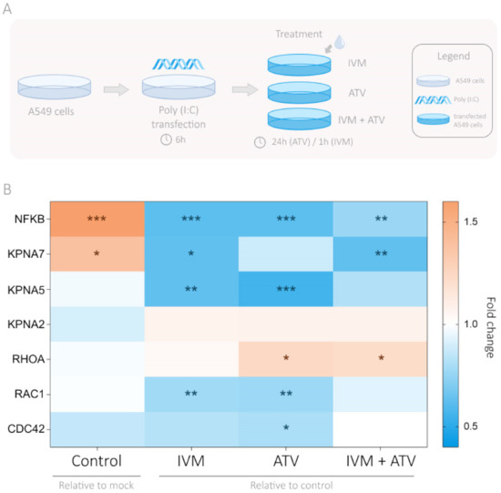 Dysregulation of importin and Rho GTPases gene expression in A549 cells transfected with Poly(I:C) and treated with IVM and ATV. (A) Experimental design of IVM and ATV treatment in a viral infection simulation context. (B) Heatmap depicting NFKB, KPNA7, KPNA5, KPNA2, RHOA, RAC1, and CDC42 fold changes in mRNA levels assessed by real time PCR (RT-qPCR) in A549 cells transfected with Poly(I:C) (10 µg/mL) and treated with PBS as the control, IVM (2.5 µM), ATV (10 µM), or the combination of both drugs (IVM + ATV). Values were normalized using PPIA as a reference gene. Gene expression for control Poly(I:C) transfected cells was relativized to mock condition. Gene expression for IVM, ATV, and IVM + ATV treated cells was relativized to the control Poly(I:C) condition. Red, white, and blue represent a fold change >1, fold change = 1 or fold change <1, respectively. * p < 0.05; ** p < 0.01; *** p < 0.001.