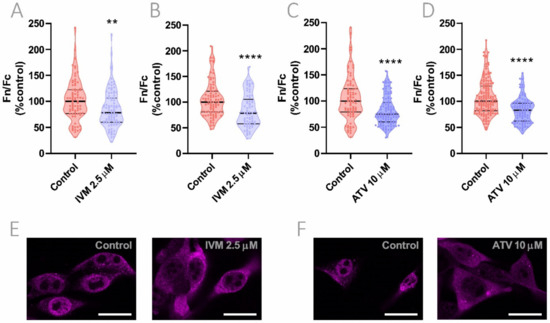 Effect of IVM and ATV on importin α nuclear accumulation. (A–D). Importin α nuclear to cytoplasmic distribution was analyzed by confocal microscopy in Hela (A,C) and Vero (B,D) cells treated with 2.5 μM IVM for 1 h (A,B) or 10 μM ATV for 24 h (C,D). Each data point represents Fn/Fc from a single cell; data were normalized to control cells and median ± quartiles are indicated. ** p < 0.01; **** p < 0.0001; Mann–Whitney test. (E,F) Representative confocal images of Hela cells exposed to IVM (E) or ATV (F) showing the effect of the drugs on importin α cellular distribution after treatment. Scale bar = 20 μm.