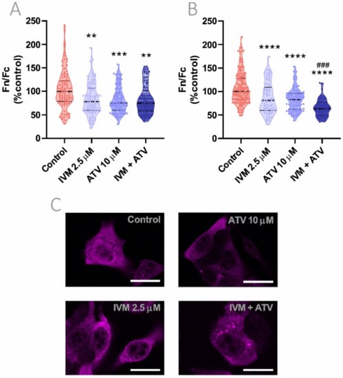 Evaluation of importin α nuclear accumulation after combination treatment using IVM plus ATV. (A) Hela and (B) Vero cells were treated with 2.5 μM IVM, 10 μM ATV, or IVM + ATV and importin α cellular distribution was evaluated by confocal microscopy. Each data point represents Fn/Fc from a single cell; data were normalized to control cells and median ± quartiles are indicated. ** p < 0.01; *** p < 0.001; **** p < 0.0001 vs. control group; ### p < 0.001 vs. IVM and ATV monotherapies; Kruskal–Wallis followed by Dunn’s multiple comparisons test. (C) Representative confocal images of Hela cells treated with IVM, ATV, and IVM + ATV showing a combination treatment effect on importin α nuclear localization. Scale bar = 20 μm.
