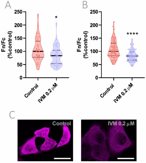 Effect of IVM at low concentration on importin α nuclear accumulation. (A,B) Importin α nuclear to cytoplasmic distribution evaluated in Hela (A) and Vero (B) cells treated with 0.2 μM IVM for 24 h. Each data point represents Fn/Fc from a single cell; data were normalized to control cells and median ± quartiles are indicated. * p < 0.05; **** p < 0.0001; Mann–Whitney test. (C) Representative confocal images of Hela cells treated with 0.2 μM IVM. Scale bar = 20 μm.