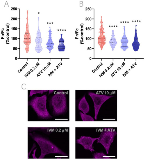 Evaluation of importin α nuclear accumulation after combination treatment using IVM at low concentration plus ATV. (A) Hela and (B) Vero cells were treated with 0.2 μM IVM, 10 μM ATV, or IVM + ATV and importin α cellular distribution was evaluated by confocal microscopy. Each data point represents Fn/Fc from a single cell; data were normalized to control cells and median ± quartiles are indicated. * p < 0.05; *** p < 0.001, **** p < 0.0001 vs. control group; Kruskal–Wallis followed by Dunn’s multiple comparisons test. (C) Representative confocal images of Hela cells treated with IVM, ATV, or IVM + ATV showing a combination treatment effect on importin α nuclear localization when low concentration IVM was used. Scale bar = 20 μm.