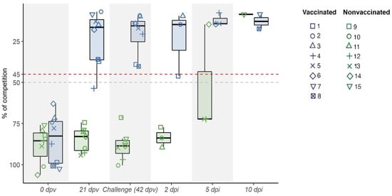 Kinetics of the IgG antibody levels against the NP detected by ELISA in sera after vaccination and viral challenge. IgG antibodies measured as percentage of competition at first vaccination (0 dpv), 21, 42 dpv (day of challenge) and at 2, 5, and 10 dpi are depicted. Points above the dashed red line (competition > 45%) are considered positive, whereas points under the dashed grey line (competition < 50%) are considered negative. Values between the two lines are considered doubtful. Groups of vaccinated and nonvaccinated animals are shown in blue and green, respectively.