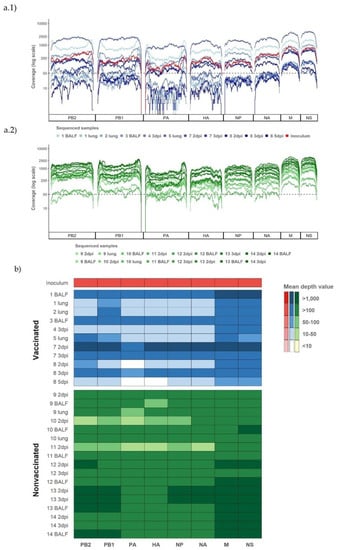 The majority of SIV genomic segments were sequenced with a coverage greater than 50 reads per position in all samples, and 309,214 out of 379,204 (81.54%) positions sequenced were represented with more than 50 reads, reaching 4378 reads as a maximum. In general, the short segments (NS, M, NA, and NP) had a better read depth per position than the larger ones did, with the segment of polymerase PA being the segment with the lowest depth (Figure 2). In total, all the eight genome segments sequenced, with a mean depth value greater than 100, were obtained for 5 and 15 samples from the vaccinated and nonvaccinated animals, respectively. By contrast, low coverage in all segments, except in NS and M, was found in the eight remaining samples from pigs 1, 2, and 5 in the lung, from pigs 8, 10, and 11 in nasal swabs at 2 dpi, and from pig 4 at 3 dpi also in the nasal swab (Figure 2a,b).