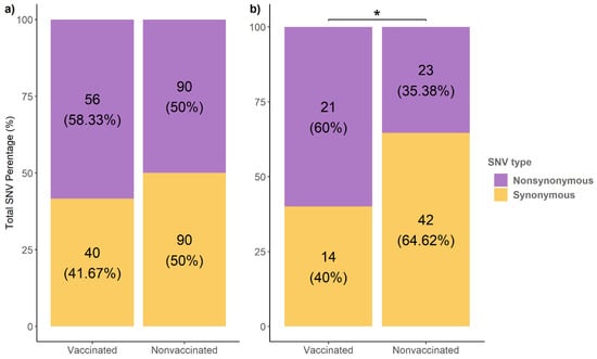 Total number of synonymous and nonsynonymous SNVs found from vaccinated and nonvaccinated animals. (a) Substitutions with an allele frequency greater than 1%. (b) Substitutions with an allele frequency greater than 5%. * p < 0.05.
