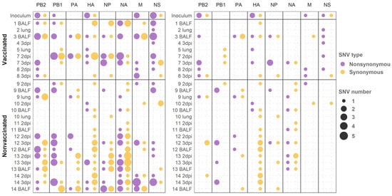 In the present work, viral replication and pathological findings were observed in both vaccinated and nonvaccinated pigs, as already reported []. However, viral shedding was lower and pathological findings were milder in vaccinated animals. Therefore, the vaccine used in the present study demonstrated its efficacy by means of less severe lesions and lower viral loads in vaccinated animals. This fact had a direct impact on sequencing results, as more samples could be sequenced from nonvaccinated animals and with greater coverage per genomic sample in comparison with samples obtained from vaccinated animals. Nevertheless, full SIV genome sequences from vaccinated animals could also be obtained, and SNVs were found in all sequenced samples from both experimental groups, evidencing intra-host variability.