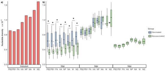 Nucleotide diversity (π) in the viral population at different time points. (a) Nucleotide diversity bars of inoculum sequence. (b) Box plot of viral population nucleotide diversity from all collected samples at 2, 3, and 5 dpi from vaccinated and nonvaccinated groups. Whiskers represent variability outside the lower and upper quartiles of each represented box. * p < 0.05.