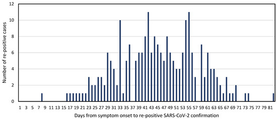 We retrospectively reviewed 295 cases reported as re-positive for SARS-CoV-2 and 836 of the close contacts of the case patients. The characteristics of the cases are shown in Table 1. Their average age was 45.2 years and 64.1% were female. At the time of the re-positive test, 55.6% were asymptomatic. The most common reasons for re-testing were either as a screening measure or because of persistent symptoms. Of the 234 individuals who were symptomatic at the time of their original diagnosis, the median time from symptom onset to the re-positive test was 45.2 days (range: 8–82 days) (Figure 1).