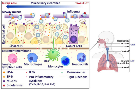 To establish an infection and propagate successfully, the influenza virus must evade the innate immune system, whose main role is to prevent or restrict viral replication. In restricting viral replication to the URT and not allowing entry into the LRT, vital respiratory functions such as gaseous exchange are not impaired. In addition, the innate immune system plays an important role in activating the adaptive immune response which is crucial in clearing any remaining influenza virus or infected cells, resolving the infection and generating memory cells that can help the host better respond to future influenza virus infections. For example, cytokines released from infected cells recruit dendritic cells (DCs) into the URT. DCs are required for activation of influenza-specific adaptive immune responses that facilitate viral clearance and the resolution of inflammation. The importance of the adaptive immune response during influenza virus infections are thoroughly reviewed elsewhere [4,8,16] and will only be briefly mentioned in this review [17,18,19].